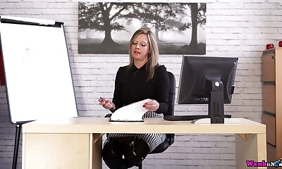 Office whore in spandex outfit Lou Pierce is unwrapping in the office