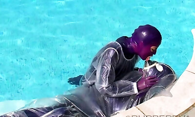 Condom latex catsuit sex, wearing high high-heeled shoes I have my face and my pussy fucked